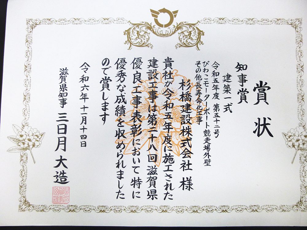 滋賀県優良工事知事賞を受賞しました。